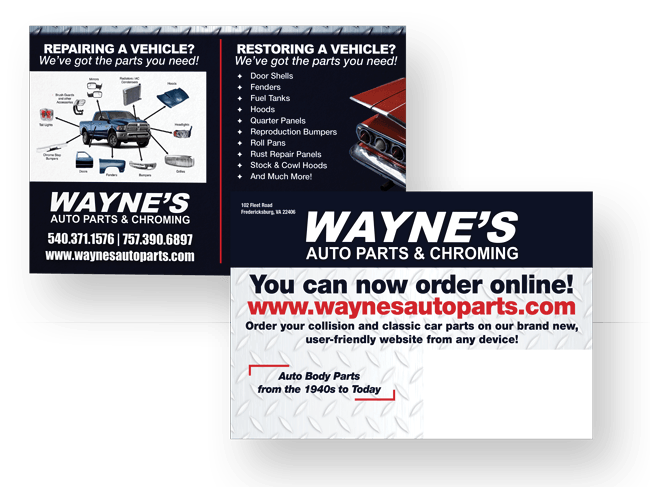 We have been working with Wayne's Auto Parts & Chroming for over 33 years and worked with them on many different marketing avenues. While design elements and marketing approaches have evolved, the brand logo has stood the test of time since 1989. From event banners to social media posts, we continue to work with Wayne's today.